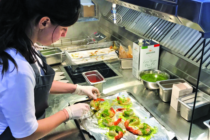 Chef Marta Cebrian Lopez easily interacts with guests while cooking at Halton’s mobile cooking station
